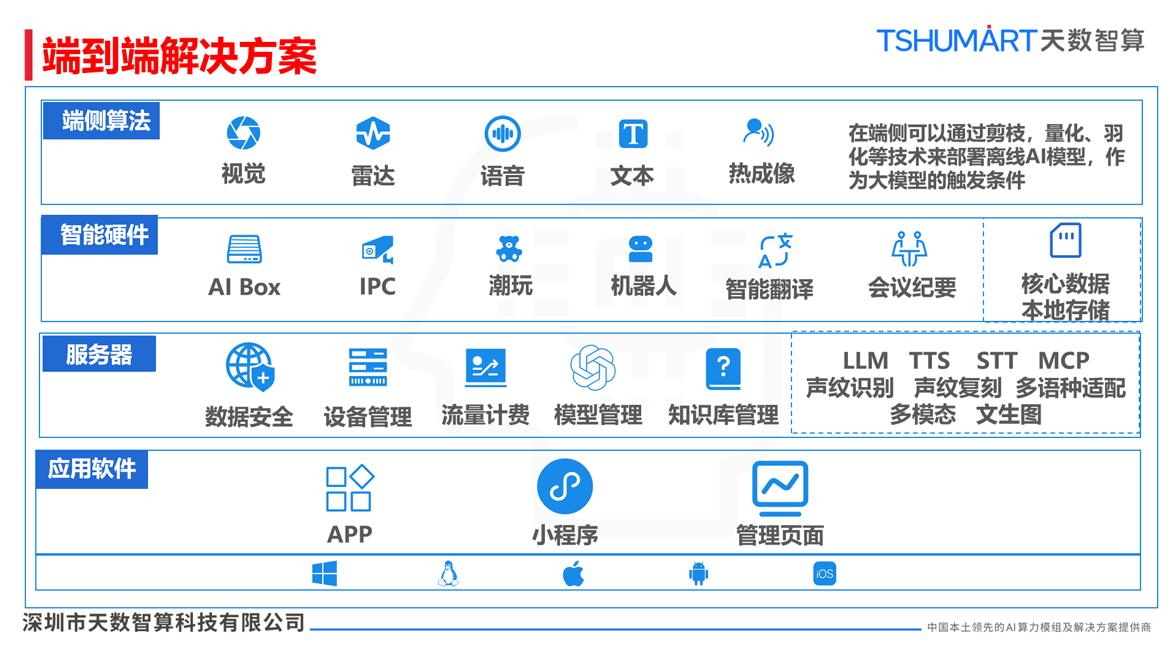当AI技术从单一功能走向全域融合,从云端算力走向端边云协同,一个万物智能互联的新时代正加速到来。作为中国本土领先的AI算力模组及解决方案提供商,天数智算深耕AI技术研发与场景落地,重磅推出AI智能体端到端解决方案,融合端侧多元算法、智能硬件载体、云端服务器能力与全场景应用软件,打通 “算法 - 硬件 - 服务器 - 应用” 全链路,以低门槛、高适配、强智能的核心优势,让AI触手可得,赋能千行百业智能化升级。