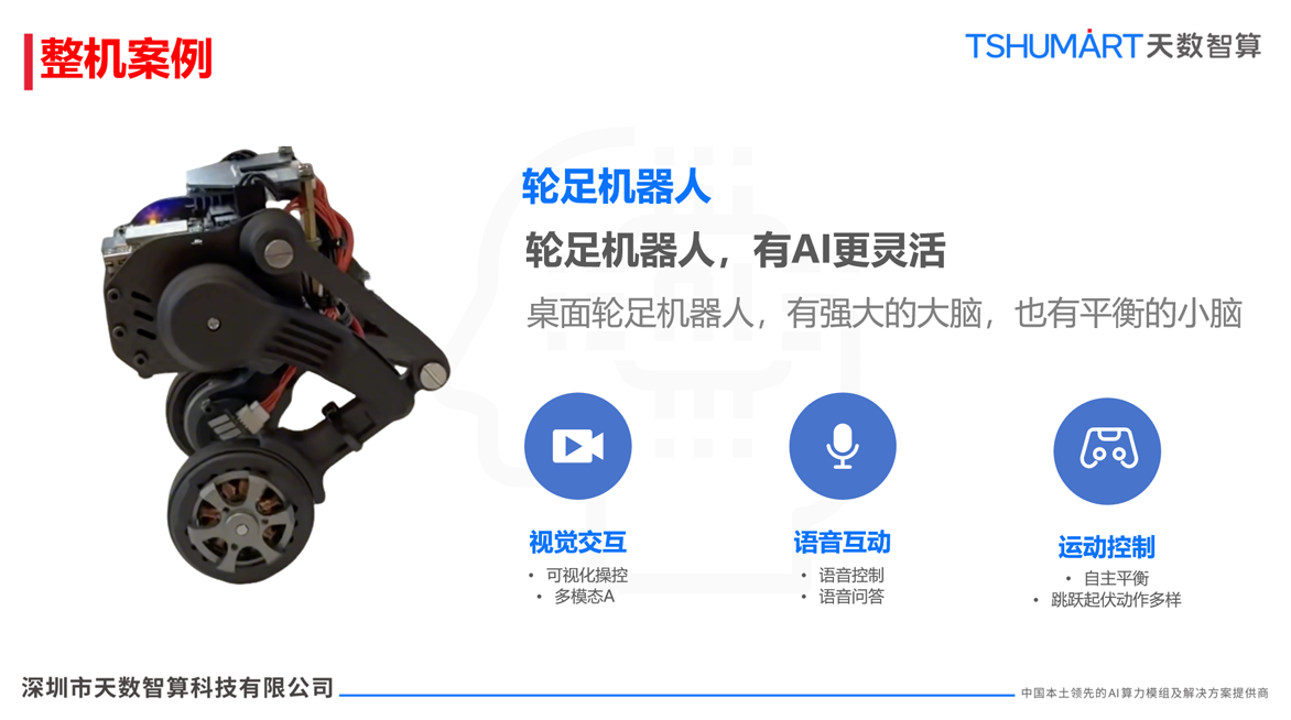 桌面轮足机器人兼具 “强大的大脑” 与 “平衡的小脑”,支持语音控制/问答、自主平衡、跳跃起伏等多样运动控制,还能实现可视化操控与多模态AI交互,让AI不仅 “会思考”,更 “会行动”,适配更多互动性场景。