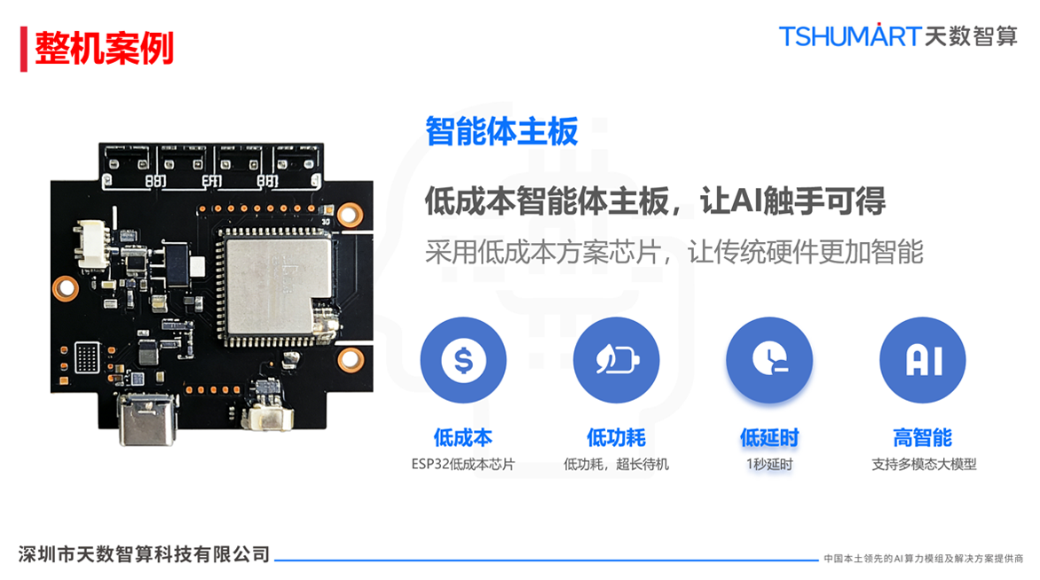 推出低成本智能体主板,采用ESP32等低成本芯片,兼具低功耗、低延时、高智能三大特点:低功耗实现超长待机,1秒低延时保障实时交互,支持多模态大模型让智能体验不打折,让传统硬件轻松升级为智能设备,真正实现 “AI低成本普惠”。