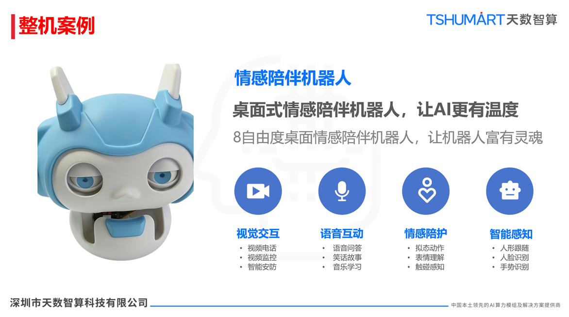 8自由度桌面情感陪伴机器人,让AI拥有“灵魂”:通过视频电话、智能安防实现视觉交互,通过语音问答、音乐学习实现语音互动,通过拟态动作、表情理解、触碰感知实现情感陪护,还具备人形跟随、人脸识别、手势识别等智能感知能力,让AI交互不再冰冷,更有温度。