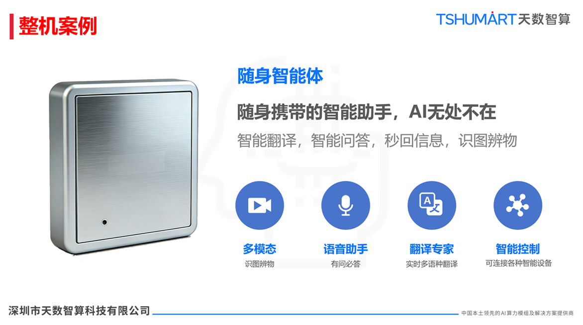 从工业生产到日常生活,从智能安防到情感陪伴,天数智算AI智能体通过多形态整机案例,让AI能力落地到每一个细分场景,打造 “AI无处不在” 的智能生态。