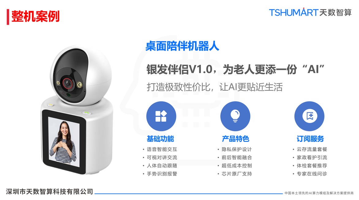 专为养老场景打造的桌面陪伴机器人,兼具语音智能交互、可视对讲、人体自动跟随、手势识别报警等基础功能,拥有隐私保护、前后端AI融合、超低成本控制等产品特色,还可通过云存流量、家政看护、在线问诊等订阅服务,为长者打造全维度的智能养老守护,让AI成为长者的暖心伴侣。